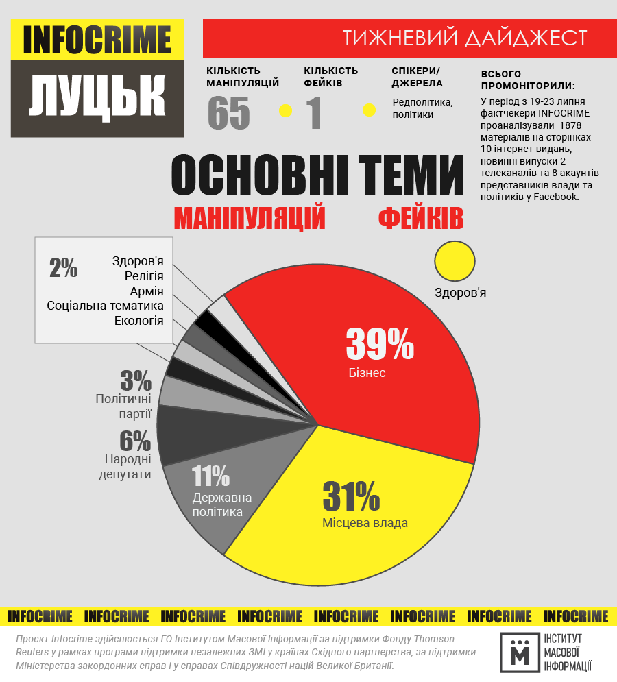 У період з 19-23 липня фактчекери проекту INFOCRIME Lutsk виявили 65 матеріалів з маніпуляціями та один фейк у промоніторених медіа Волині. Цікаво, що такі ж дані були і в попередньому дайджесті.