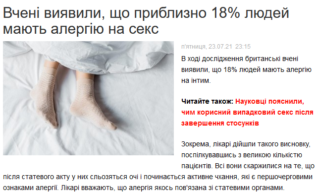 На сайті «Під прицілом» є новина з назвою «Вчені виявили, що приблизно 18% людей мають алергію на секс». Однак тут не вказали конкретно, які британські вчені це з’ясували. Також немає жодних посилань на дослідження. Соціологів розсмішило б таке речення: «лікарі дійшли такого висновку, поспілкувавшись з великою кількістю пацієнтів». Невідомо нічого про кількість людей та звідки в них така інформація. Також у цій у новині зазначили знову без вказування джерела, що «вчені вважають, що скоро алергію на секс внесуть до списку захворювань».