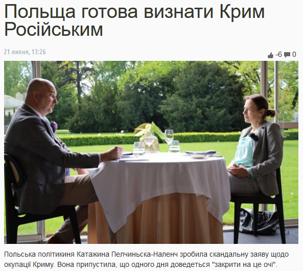 У новині «Польща готова визнати Крим Російським» на сайті «Волинь24» є маніпуляція. Видання подає думку однієї польської політикині як позицію всієї Польщі. Однак це не так. У цьому випадку думка однієї людини не може відображати позицію всієї держави. Українським виданням треба уважно висвітлювати тему окупації Криму, особливо якщо цю тему коментує хтось з іноземних політиків.