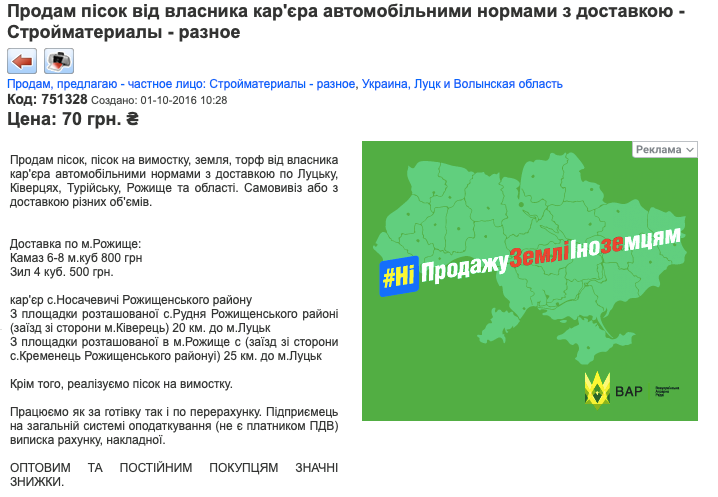 У мережі «Володя Діла» ще у 2016-ому році розмістив оголошення про продаж піску від власників кар’єрів. Серед них і ті, які належать згаданому вище волинському депутату-радикалу Сергієві Котюку.