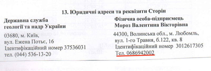 Цікава деталь, у супровідних до спецдозволу документах, угоді між Держгеонадрами та Валентиною Мороз, зазначено номер телефону сторонньої особи. Цей же номер бачимо в реквізитах ще одного дослідника надр на Волині Форманюка Дмитра Богдановича. Людина з повним співпадінням прізвища, імені та по-батькові була колегою Володимира Бондаря у лісовій галузі – помічником лісничого Державного підприємства «Цуманське лісове господарство». Дмитру Форманюку Держгеонадра видали спецдозвіл на дослідження покладів піску у Старовижівському районі.