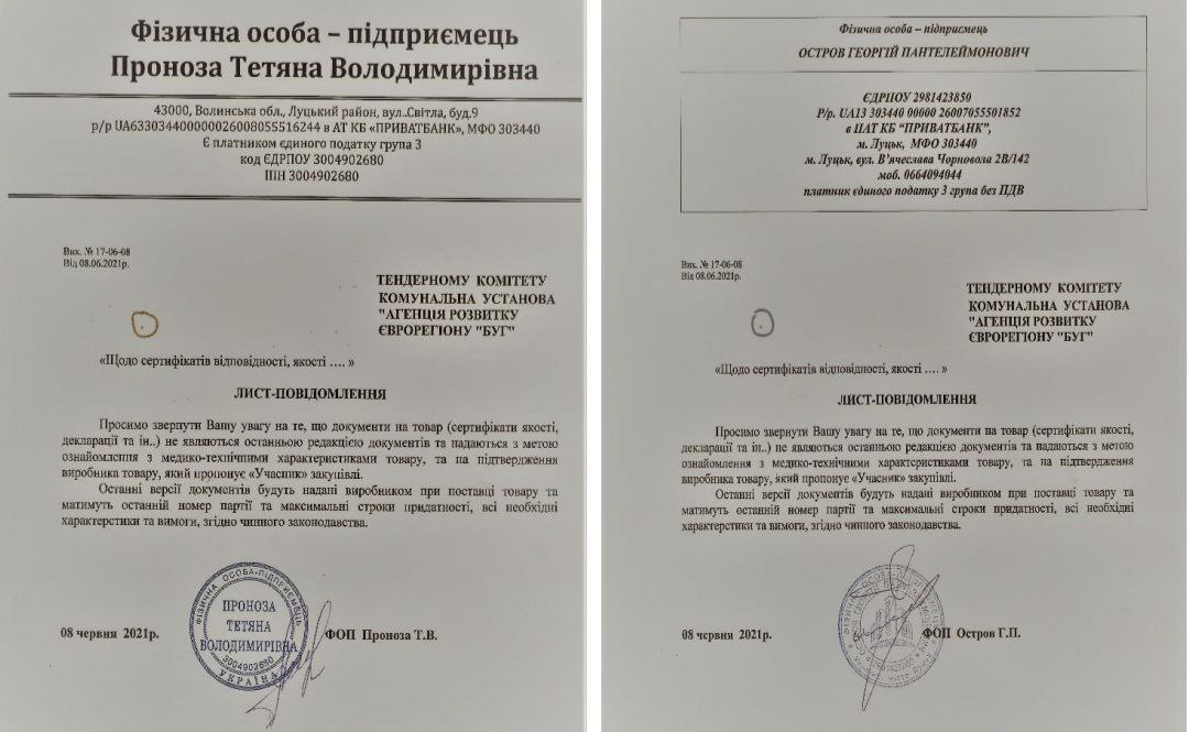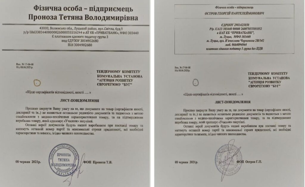 Тоді «Сила правди» з’ясувала, що Тетяна Проноза та Георгій Остров – бізнес-партнери. Вони заснували у Луцьку приватне підприємство «Медторг-Експрес» і товариство з обмеженою відповідальністю «Приватна поліклініка «Мед-Експрес», які займаються загальною медичною практикою. Для участі у закупівлі підприємці в один день подали схожу документацію. Зокрема, їхні довідки мають однакові вихідні дані, зміст, помилки та дефекти друку/сканування.