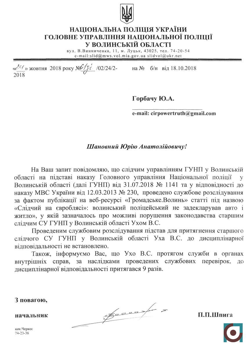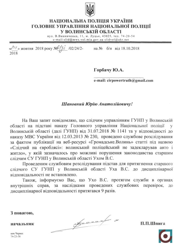 Поліція провела внутрішнє службове розслідування, але порушень в таких діях поліцейського не побачили. «Підстав притягнення до дисциплінарної відповідальності не встановлено», – повідомили листом з управління Нацполіції. Хоча, до цього за 10 років служби в органах внутрішніх справ Володимира Ухо до дисциплінарної відповідальності притягували аж 9 разів.