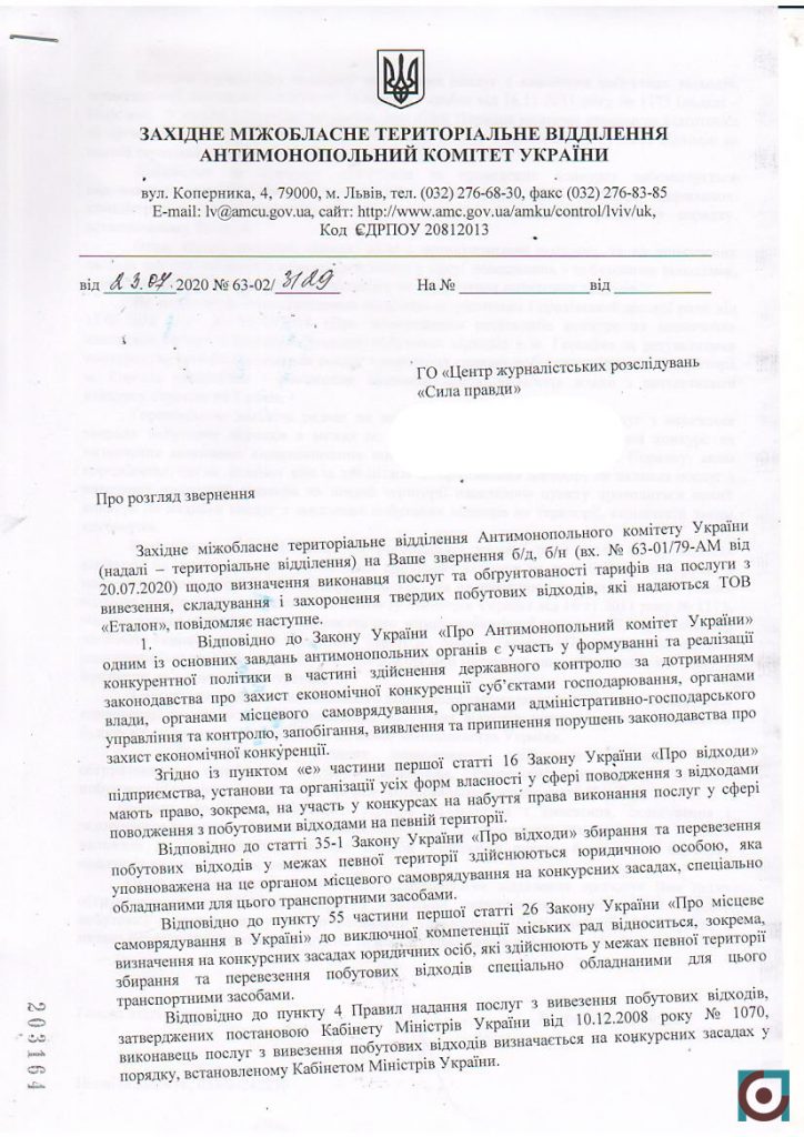 Таким чином Західне міжобласне територіальне відділення Антимонопольного комітету України відреагувало на розслідування Центру журналістських розслідувань «Сила правди» та звернення журналістів щодо сміттєвої проблеми в Горохівському районі.