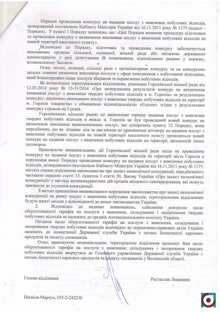 «Рішенням Горохівської міської ради від 12.03.2014 року «Про затвердження результатів конкурсу на визначення виконавця послуг з вивезення твердих побутових відходів в м. Горохів» згідно з результатами конкурсу терміном на 5 років було визначено виконавцем вказаних послуг товариство з обмеженою відповідальністю «Еталон»… По закінченню терміну надання послуг з вивезення твердих побутових відходів в межах м. Горохів не був проведений новий конкурс, що суперечить пункту 32 Порядку, яким передбачено, що не пізніше, ніж за два місяці до припинення договору на надання послуг з вивезення побутових відходів на певній території населеного пункту проводиться новий конкурс. Враховуючи це, дії Горохівської міськради містять ознаки порушення законодавства про захист економічної конкуренції» – йдеться у листі датованому 23-м липня 2020 року за підписом голови відділення АМКУ Ростислава Лещишина.