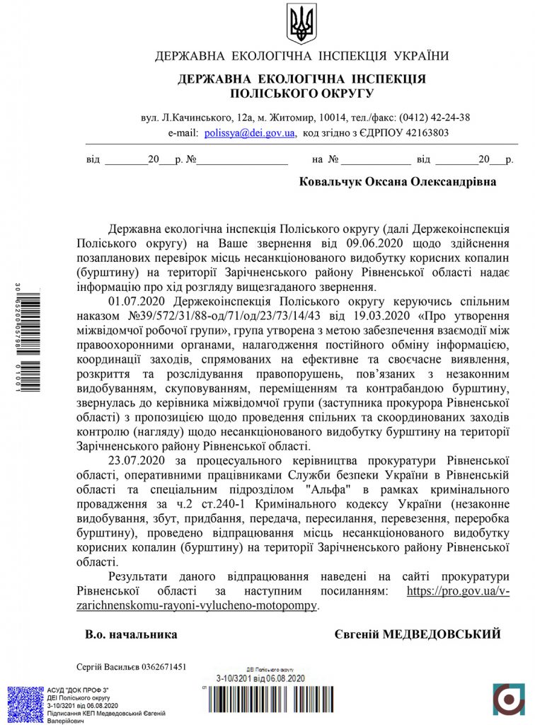 Окрім того, Центр журналістських розслідувань «Сила правди» отримав лист від Державної екологічної інспекції Поліського округу, в якому екологи відрапортували, що цей рейд став результатом звернення наших журналістів.