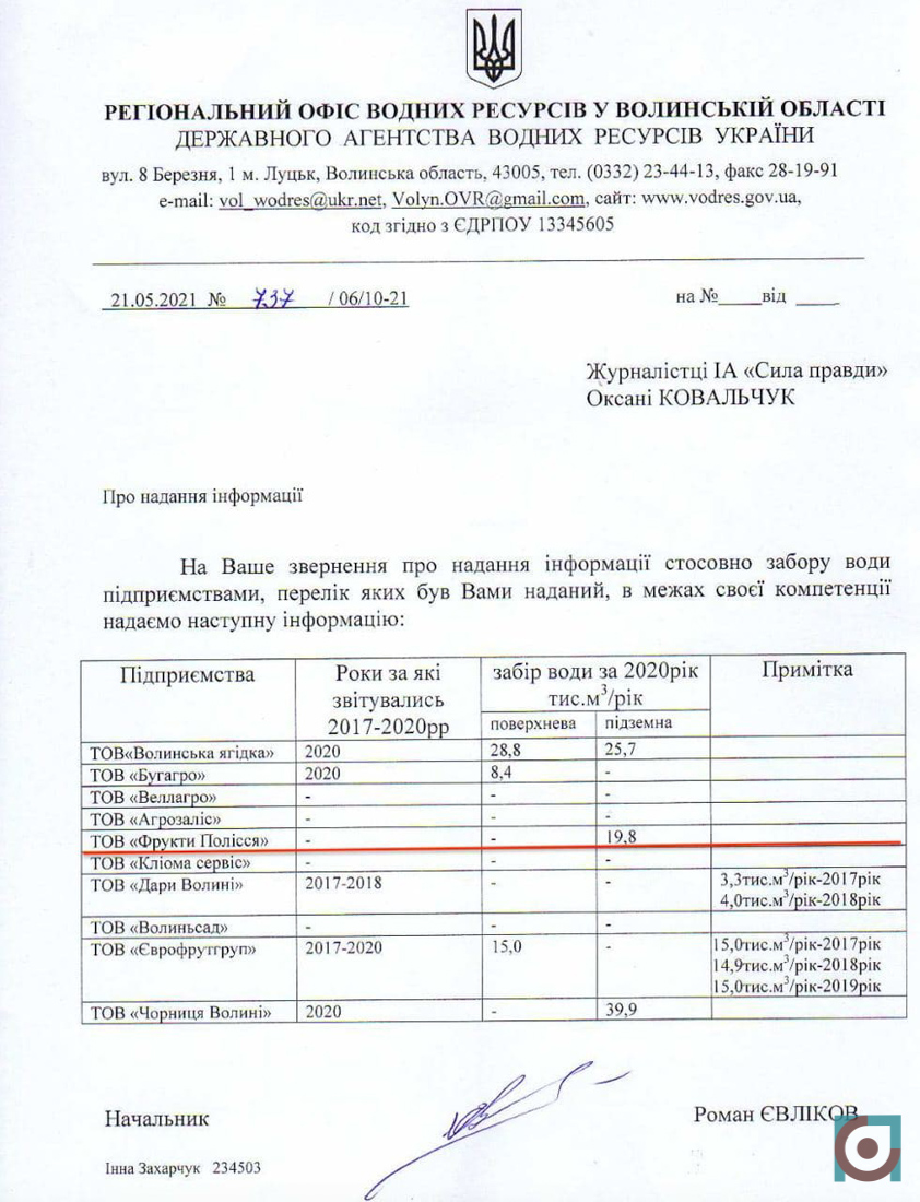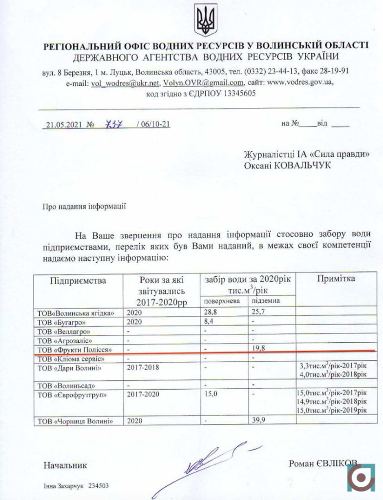 У реєстрі дозволів на спеціальне водокористування оприлюднено два документи, видані ТОВ «Фрукти Полісся». Згідно з першим, фірмі надали ліміти на використання 261 кубометра води на добу, або 47 тисяч кубометрів на рік з однієї свердловини. Проте, після того, як «Сила правди» звернулася за поясненнями до директора підприємства Андрія Ланіна, у травні 2021-го цей дозвіл анулювали і видали новий. Підприємству встановили нові ліміти: 281 кубометр води на добу і 56 метрів кубічних води на рік. Проте вже з двох свердловин.