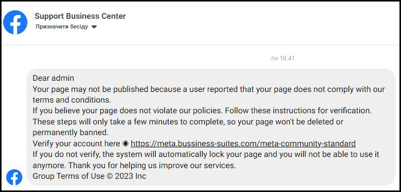 У 2023 році почастішали спроби викрадення доступів до бізнес-сторінок журналістів та медіа у соціальних мережах. Нещодавно луцька медійниця, психологиня та піарниця Катерина Той отримала декілька повідомлень з фішингом у соціальній мережі Facebook. Вона опублікувала 21 жовтня скриншот від невідомого користувача про те, що на її фан-сторінці (з психології. – авт.) нібито виникли проблеми з вимогами Facebook.