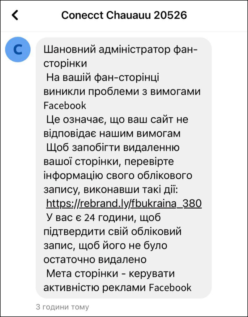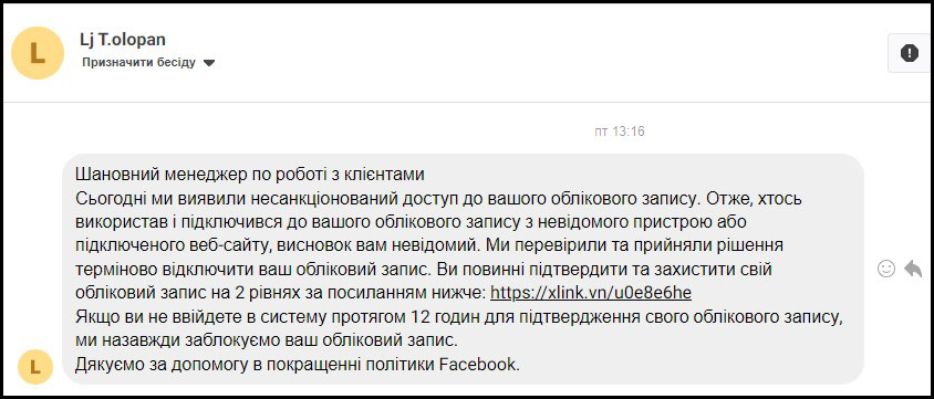 Експертка ГО «Лабораторія цифрової безпеки» Мар’яна Яцишин каже, що такі повідомлення – це фішинг, спрямований на викрадення пароля та доступу до Facebook. А за посиланням – сторінка, що схожа на Facebook.