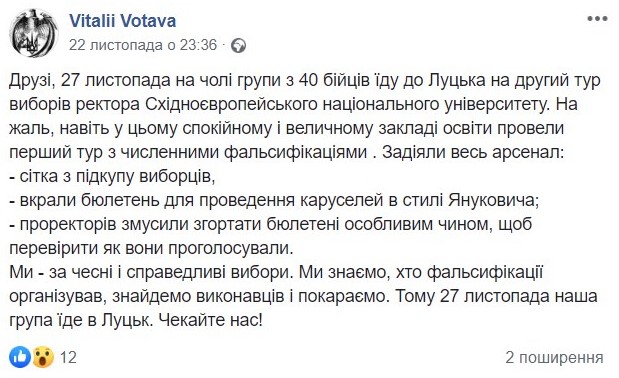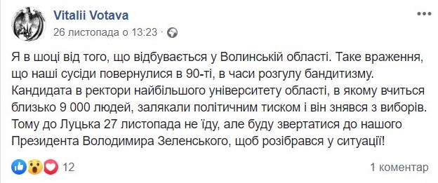 Згодом, коли Коцан зняв свою кандидатуру, Вотава опублікував ще один допис про те, що більше не планує їхати до Луцька, проте обурений ситуацією з виборами очільника ВНЗ.