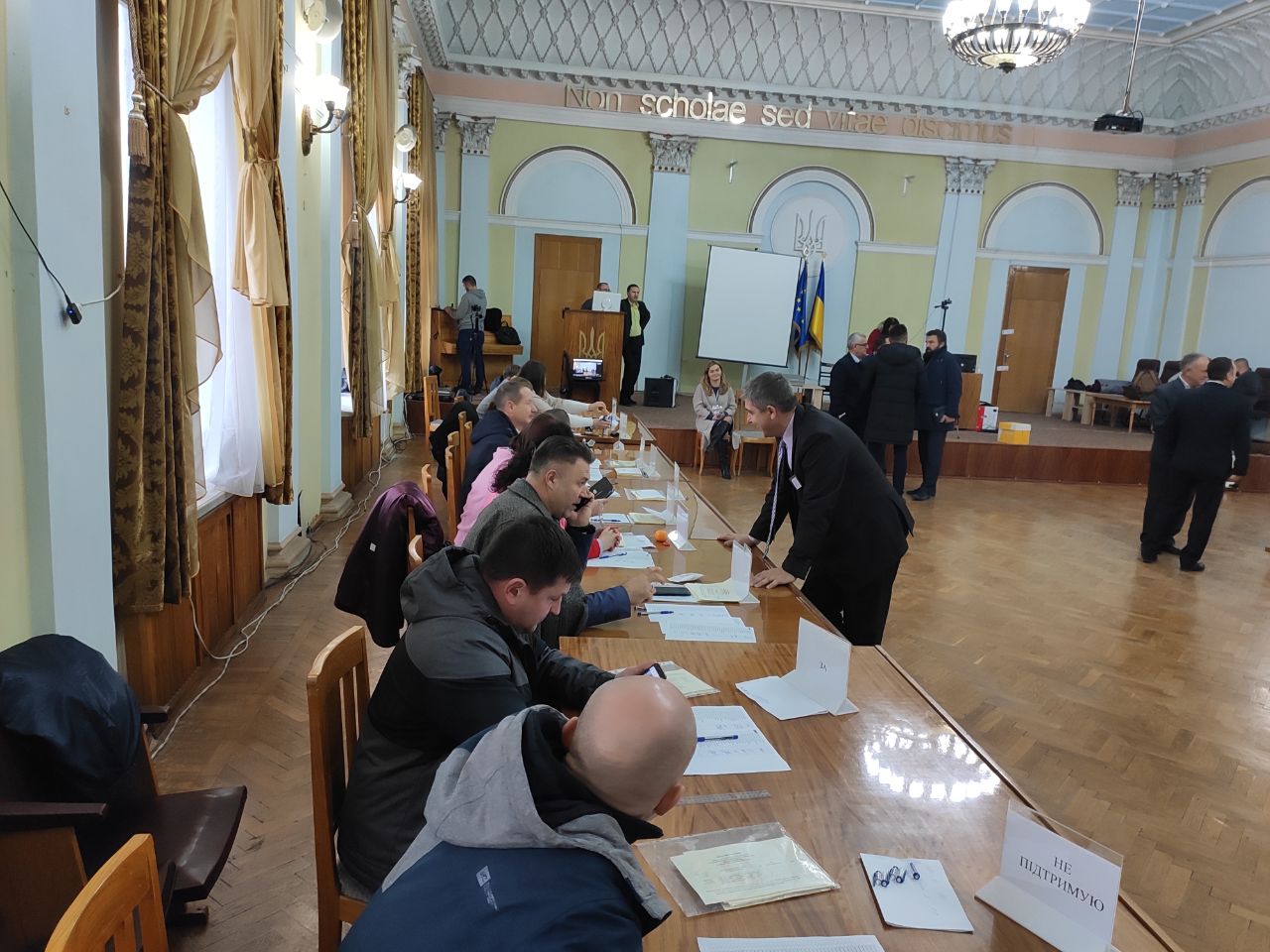У бюлетенях було лише одне ім’я — Анатолій Цьось. Навпроти нього — колонки «підтримую» та «не підтримую». Якби кандидат отримав менше 50% голосів «за», вибори вважались би такими, що не відбулись. Як прописано у положенні про порядок проведення виборів, у такому разі Міністерство освіти та науки мало б знову оголошувати конкурс на посаду ректора університету.