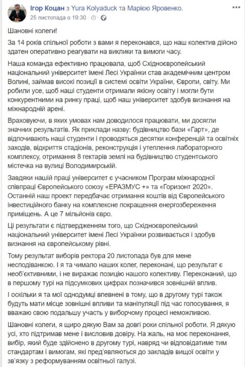 «На жаль, на моє переконання, вибір, який буде здійснено в другому турі, навряд чи відповідатиме тим стандартам і вимогам, які пред’являються до закладів вищої освіти у зв’язку з реформуванням освітньої галузі», — пише ексректор.