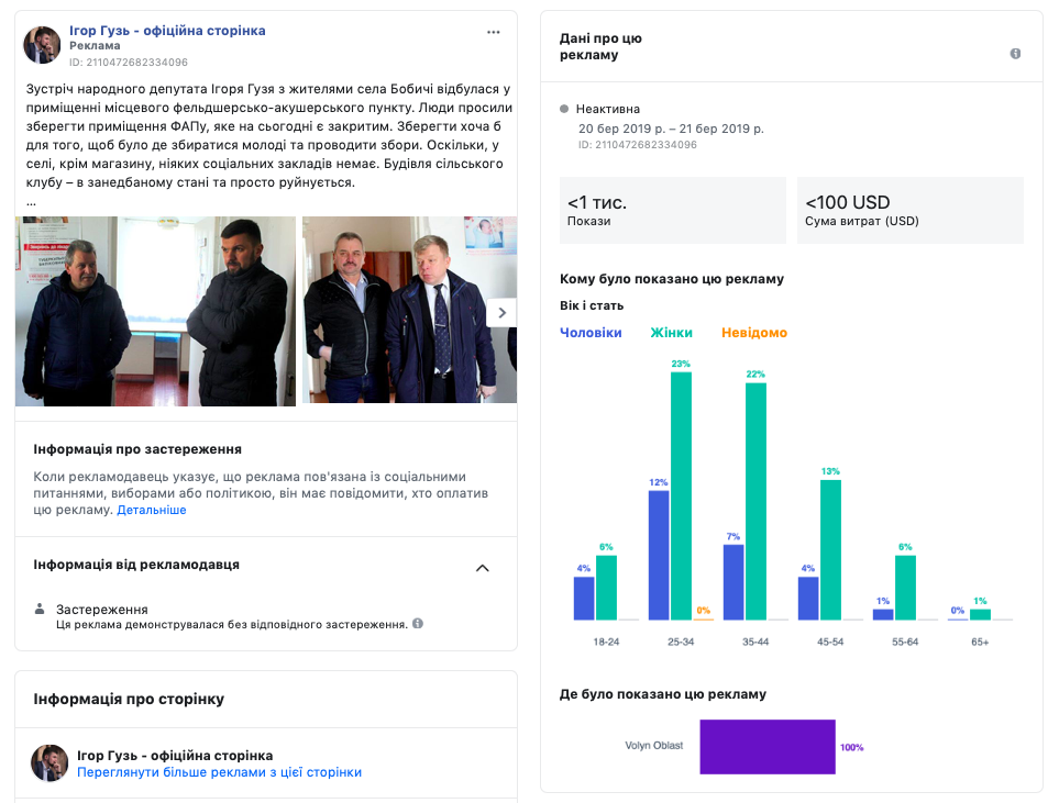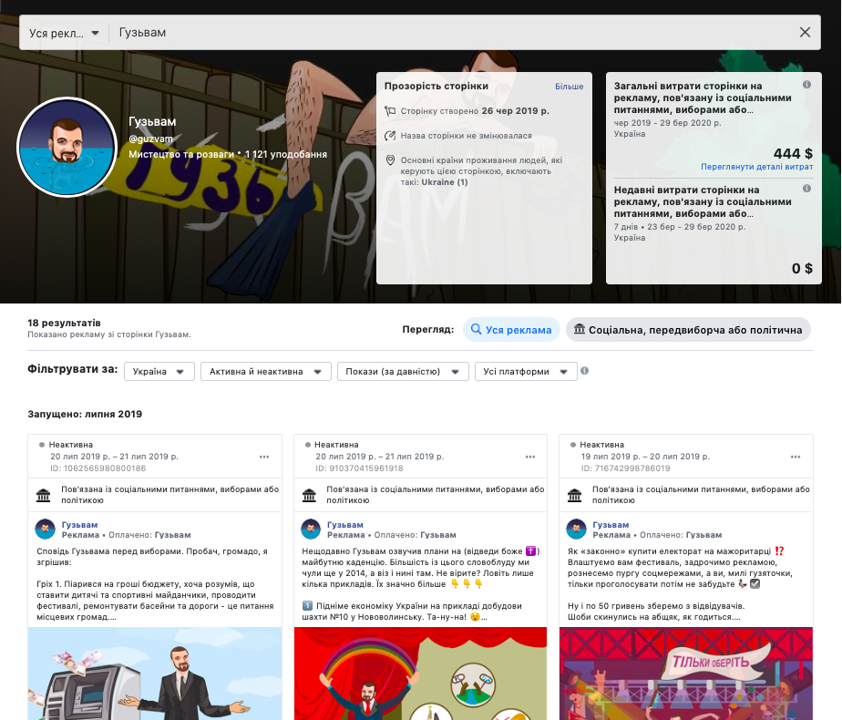 Найбільше негативних рекламних повідомлень було виявлено на сторінці «Гузьвам» – 18. Всі вони були спрямовані на дискредитацію кандидата у народні депутати Ігоря Гузя. Сторінка була створена уже в ході виборчої кампанії 26 червня 2019 року і містить інформацію про рекламодавця, зокрема: рекламодавець – Гузьвам, номер телефону – +380986824123, електронна адреса – [email protected], адреса – 45400, м. Нововолинськ, пров. Переселенців, 5. На публікацію усіх матеріалів на сторінці було витрачено 444 американських доларів.