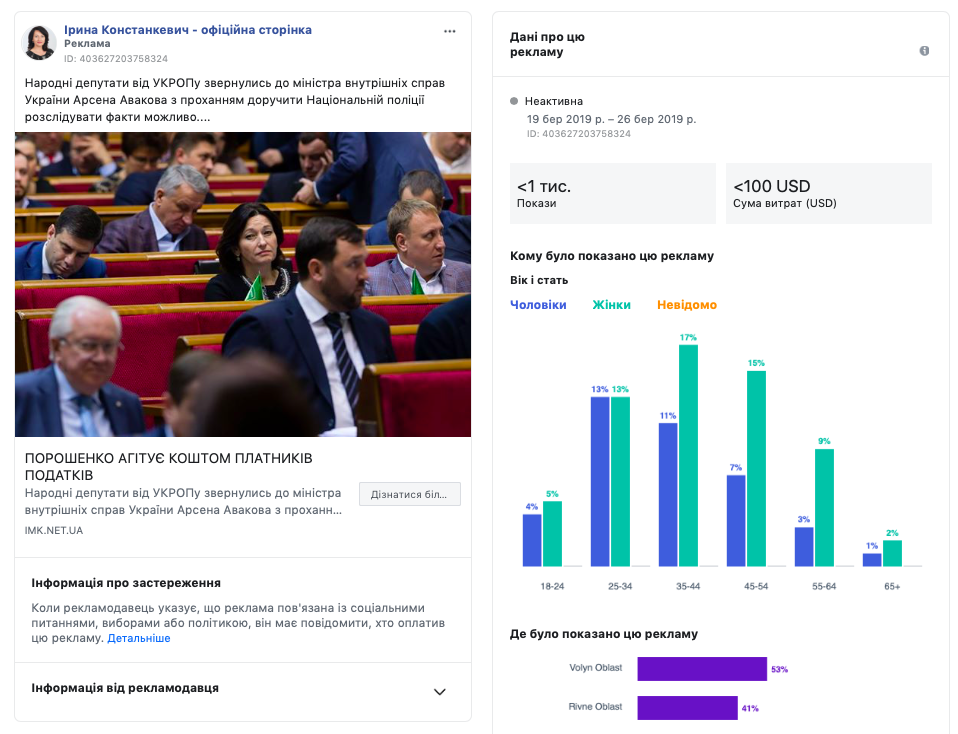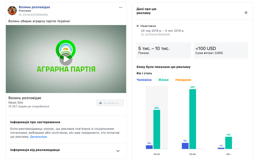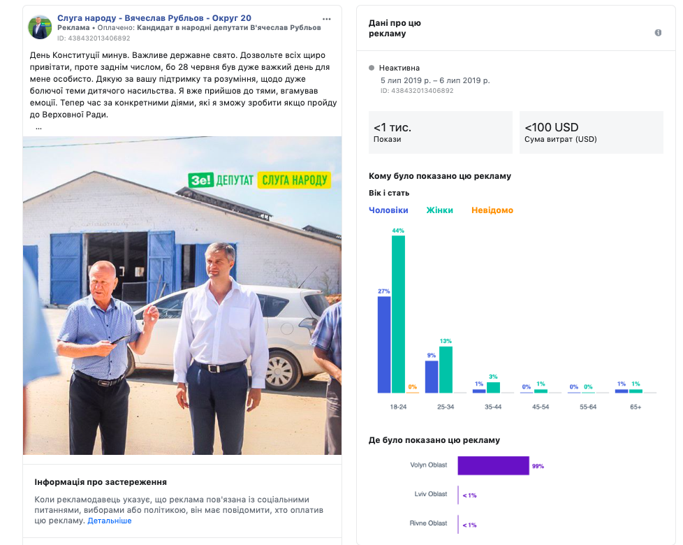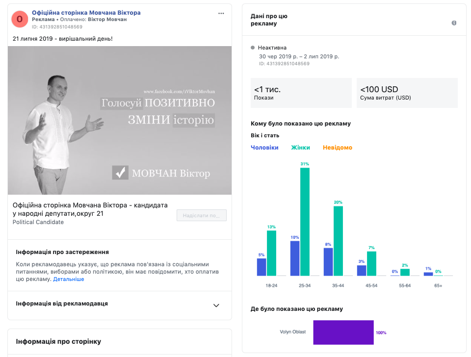 У Бібліотеці реклами Facebook ОПОРА виявила 55 сторінок в соціальній мережі Facebook, які протягом 2019 року розміщували рекламні оголошення позитивного змісту у Facebook та Instagram про місцевих політиків (переважно кандидатів у народні депутати від Волині) та політичні партії і їх регіональних лідерів.