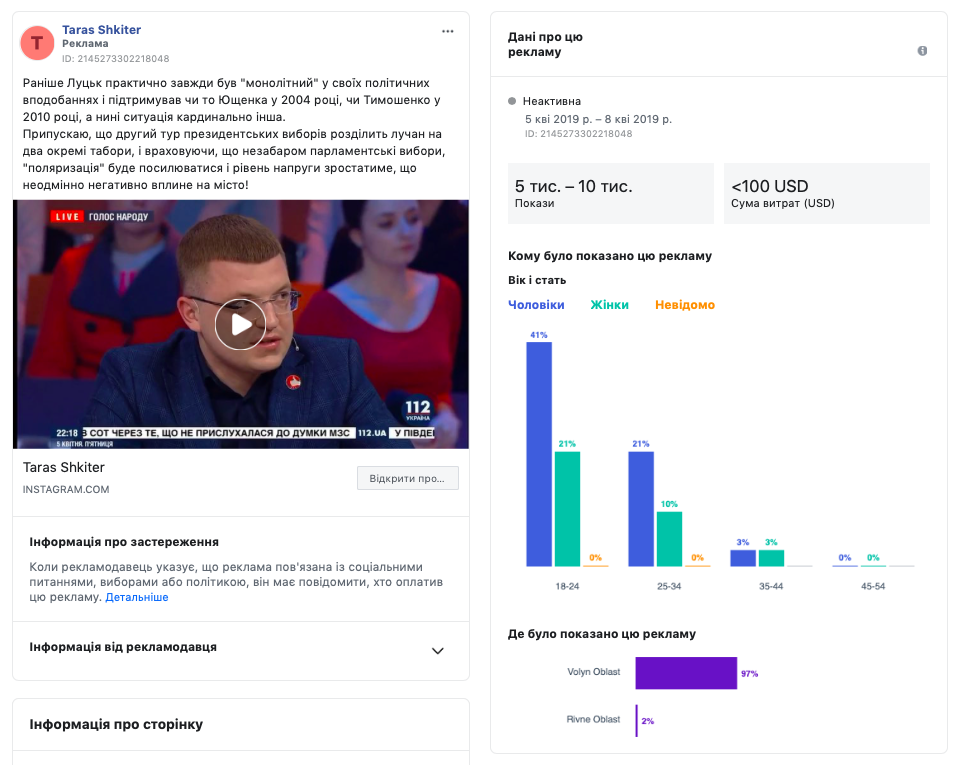 «Моє місто – Луцьк» та «volyn.com.ua» – сторінки у соцмережі Facebook, які безпосередньо пов’язані із Волинською областю, публікували матеріали, спрямовані на дискредитацію Володимира Зеленського та політичної партії «Слуга народу». На першій сторінці рекламні матеріали публікувалися без застереження, тобто без вказання рекламодавця та його контактів. Відтак, така реклама була припинена адміністрацією Facebook. На другій сторінці була вказана інформація про рекламодавця. Загалом на цих сторінках було опубліковано 4 рекламні пости, два з яких вартістю від 0 до 100 американських доларів, один – від 100 до 200 американських доларів, ще один – від 100 до 500 американських доларів.
