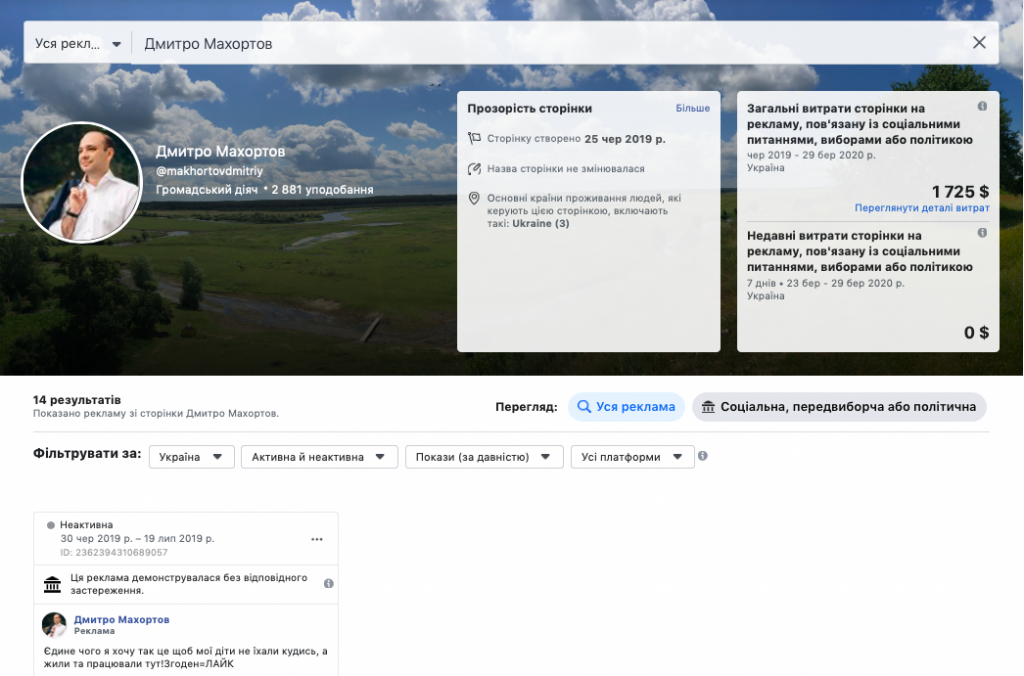 По-друге, у червні 2019 року в Бібліотеці реклами Facebook інформацію про витрати сторінок на рекламу, пов’язану із соціальними питаннями, виборами або політикою «обнулили». Відтак, нині сума загальних витрат на рекламу порахована на основі вартості усіх рекламних постів, опублікованих із червня 2019 року до сьогодні.