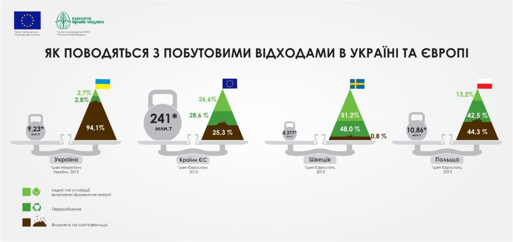 В Україні під сміттєзвалищами і полігонами опинилось понад 9 тисяч гектарів землі. У нас переробляють і утилізовують близько 6% відходів. Решту захоронюють на полігонах і смітниках. У сусідній Польщі, за даними 2016 року, на полігони йшла лише половина всього сміття, а в Швеції – 1%.