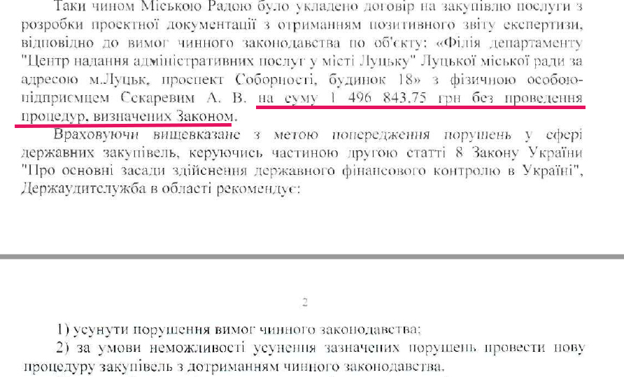 Посадовці Луцької міської ради замовили виготовлення проектної документації на реконструкцію РАЦСу за півтора мільйона гривень. Про це ми писали у матеріалі «Мільйонна оборудка: як Луцька міськрада реконструює РАЦС без відома громади». Послугу із розроблення проектної документації замовили у одеського архітектора без оголошення тендеру. Для суми, від якої потрібно було б оголошувати тендер, посадовцям не вистачило всього 4 тисячі гривень. Тож міські чиновники просто уклали договір із ФОПом Анатолієм Єскарєвим на розроблення проектної документації вартістю 1 496 843, 75 гривень.