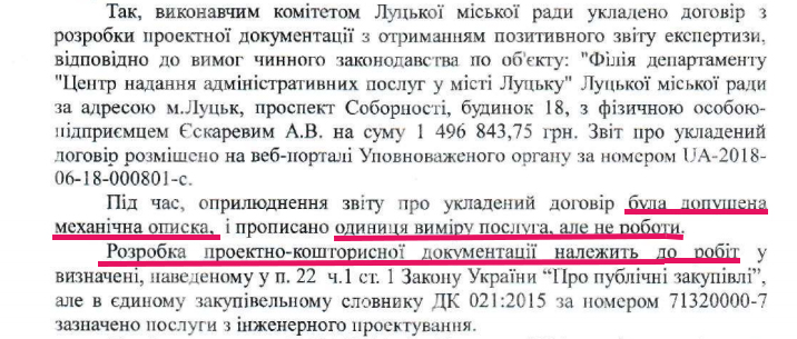 Вони провели тендер і там вказали що це є послуга, – пояснює Віктор Гальчук, заступник Начальника управління Західного офісу Державної аудиторської служби України. – Тобто, якщо послуга – це 200 тисяч, якщо роботи – 1,5 мільйона. Вони написали, що помилково вказали у тендерній документації, що це є послуга. І дають відповідь, що була допущена механічна описка.