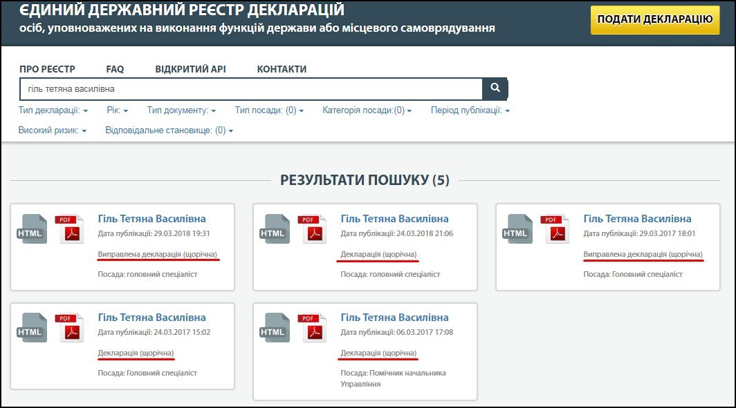 Відсутність форми змін від Тетяни Гіль на сайті НАЗК виявив Центр журналістських розслідувань «Сила правди».