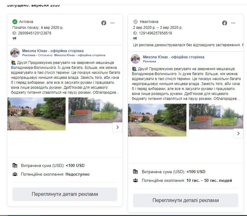 Зі сторінки «Микола Юнак – офіційна сторінка» протягом вказаного періоду вмикали на рекламу два ідентичні пости. Вони стосуються облагородження території міста Володимир-Волинський активістами, і кожен коштував від 0 до 100 доларів. Однак допис, який рекламувався 2-3 вересня, транслювався без відповідного застереження (не був оплачений). Ще одна ідентична публікація, яка рекламувалась з цієї сторінки, натомість уже мала позначку про застереження.