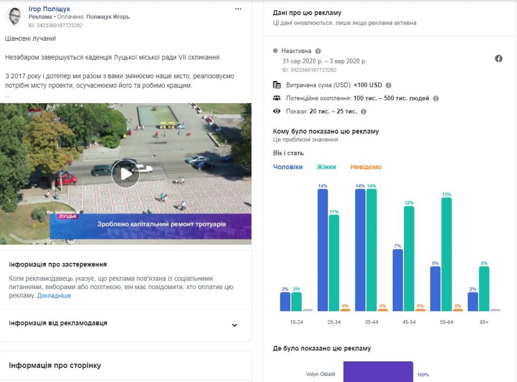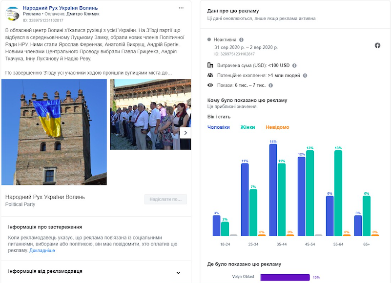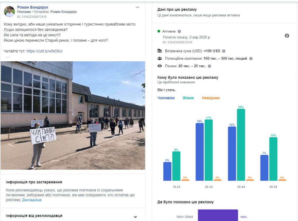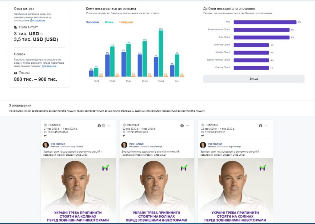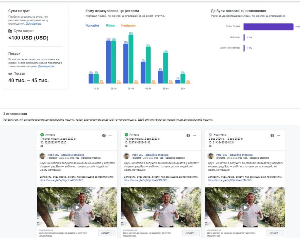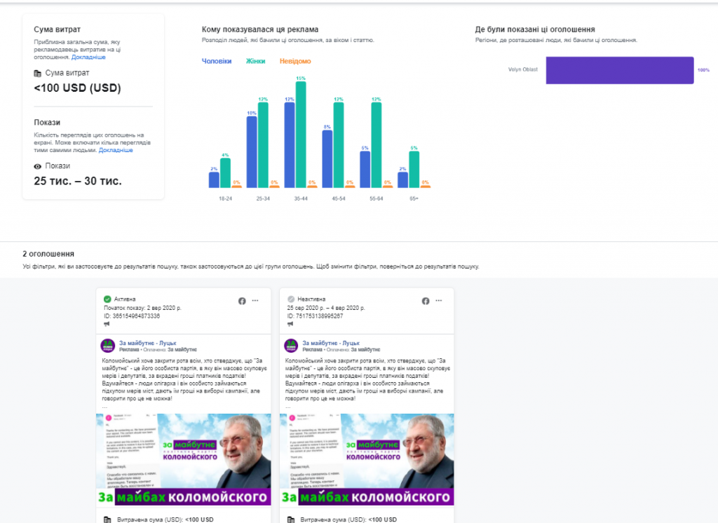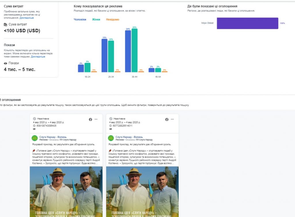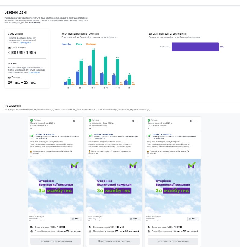 Зауважимо, що рекламні повідомлення, пов’язані із соціальними питаннями, виборами або політикою, таргетувалася на різні регіони, а не лише на Волинь. Ціни за рекламні публікації також були різними: від 0 до 3-3,5 тис. доларів.