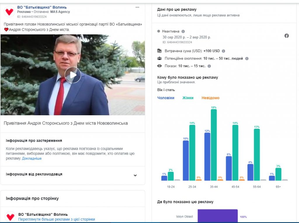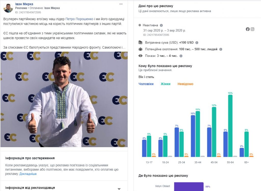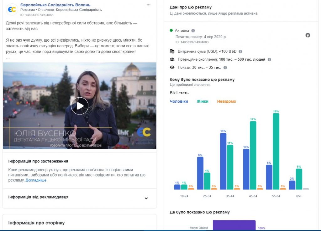 Сторінка «Європейська Солідарність Волинь» протягом тижня до старту виборчої кампанії рекламувала два дописи, таргетовані на Волинську область. Кожен із них коштував у межах 0-100 доларів. Проте загалом за період 27 серпня – 2 вересня вартість реклами зі сторінки, пов’язаної із соціальними питаннями, виборами або політикою, склала 179 доларів.