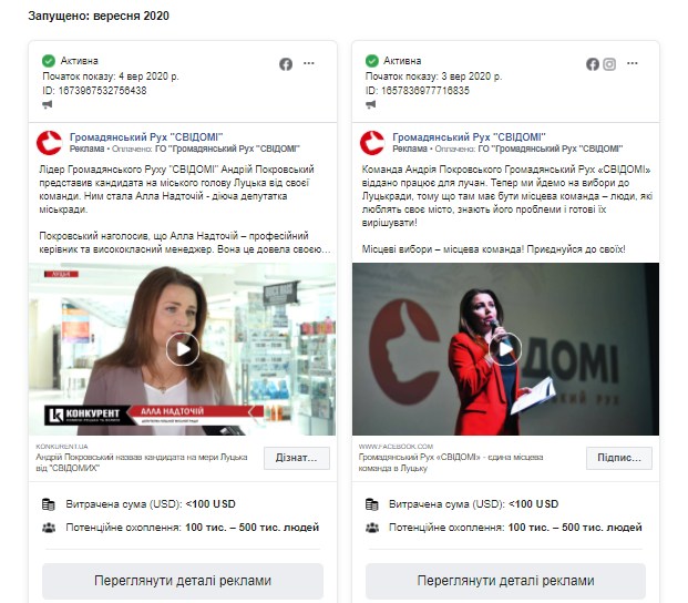 Зі сторінки «Громадянський Рух «СВІДОМІ» рекламувалося два дописи, кожен із яких вартував 0-100 доларів, однак вартість реклами обох також склала менше 100 доларів. Йдеться про публікації, котрі інформували про роботу команди, а також те, що за посаду міського голови змагатиметься Алла Надточій. Станом на 5 вересня обидва пости активні.