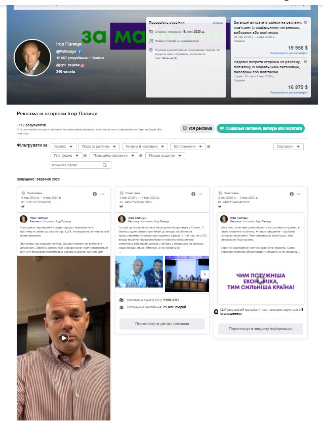 Абсолютним рекордсменом і за кількістю постів, і за обсягом витрачених коштів стала сторінка «Ігор Палиця», котра присвячена діяльності народного депутата від Луцька та лідера партії «За майбутнє». Йдеться про 27 постів, ввімкнених на рекламу після 27 серпня, та 50 – у вересні. У більшості ідентичні публікації рекламували по кілька разів – від 2 до 6, однак є й 11 унікальних публікацій, котрі рекламувалися лише раз.