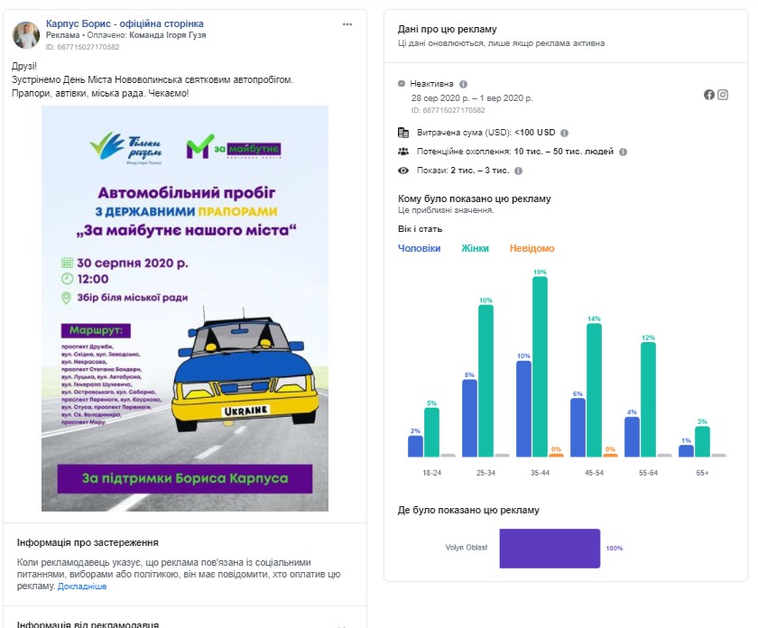 Зі сторінки потенційного кандидата на посаду Нововолинського міського голови «Карпус Борис – офіційна сторінка» протягом вказаного періоду вмикали на рекламу 2 дописи, кожен і яких вартував від 0 до 100 доларів і був таргетований на користувачів на території Волинської області. Один із постів містив відеовітання до Дня міста Нововолинська, інший – рекламував автопробіг, організований за підтримки потенційного кандидата до того ж Дня міста.