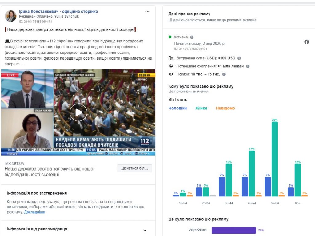Сторінка «Ірина Констанкевич – офіційна сторінка» відзначилася одним рекламним дописом, котрий обійшовся від 0 до 100 доларів. Просували у мережі пост із відеоефіром каналу 112, на котрому нардепка коментувала питання стосовно освітньої галузі.