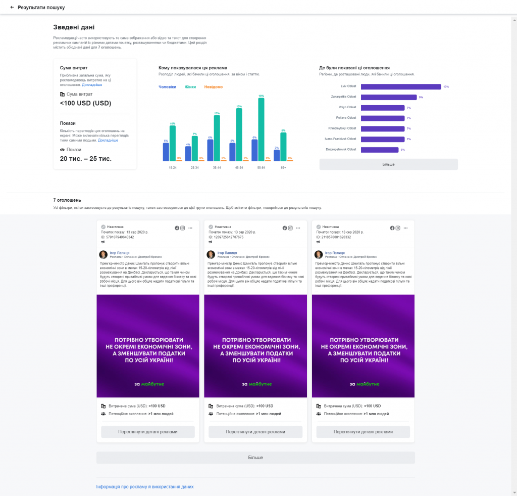 Нагадаємо, що у звіті Бібліотеки реклами Facebook не подається точної інформації про вартість політичної реклами, якщо вона не перевищила 100 американських доларів. Відтак, при аналізі витрат рекламодавців на таку рекламу вказувалося дві суми: мінімальну та максимальну (від 0 до 100 американських доларів).