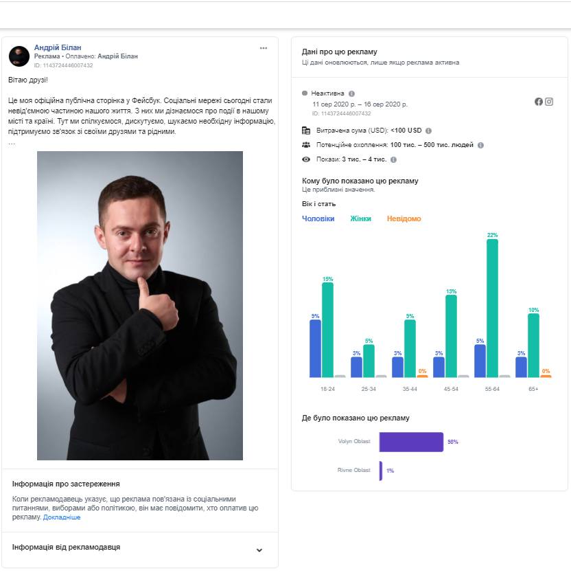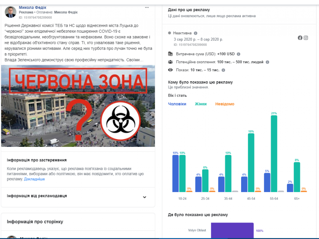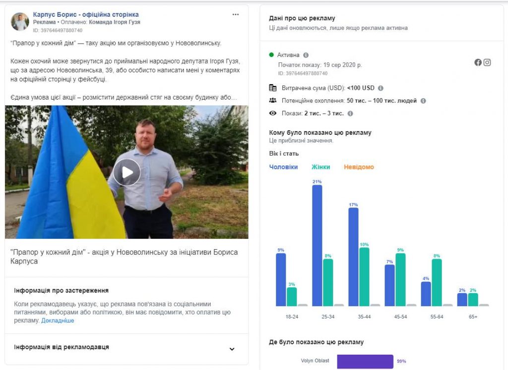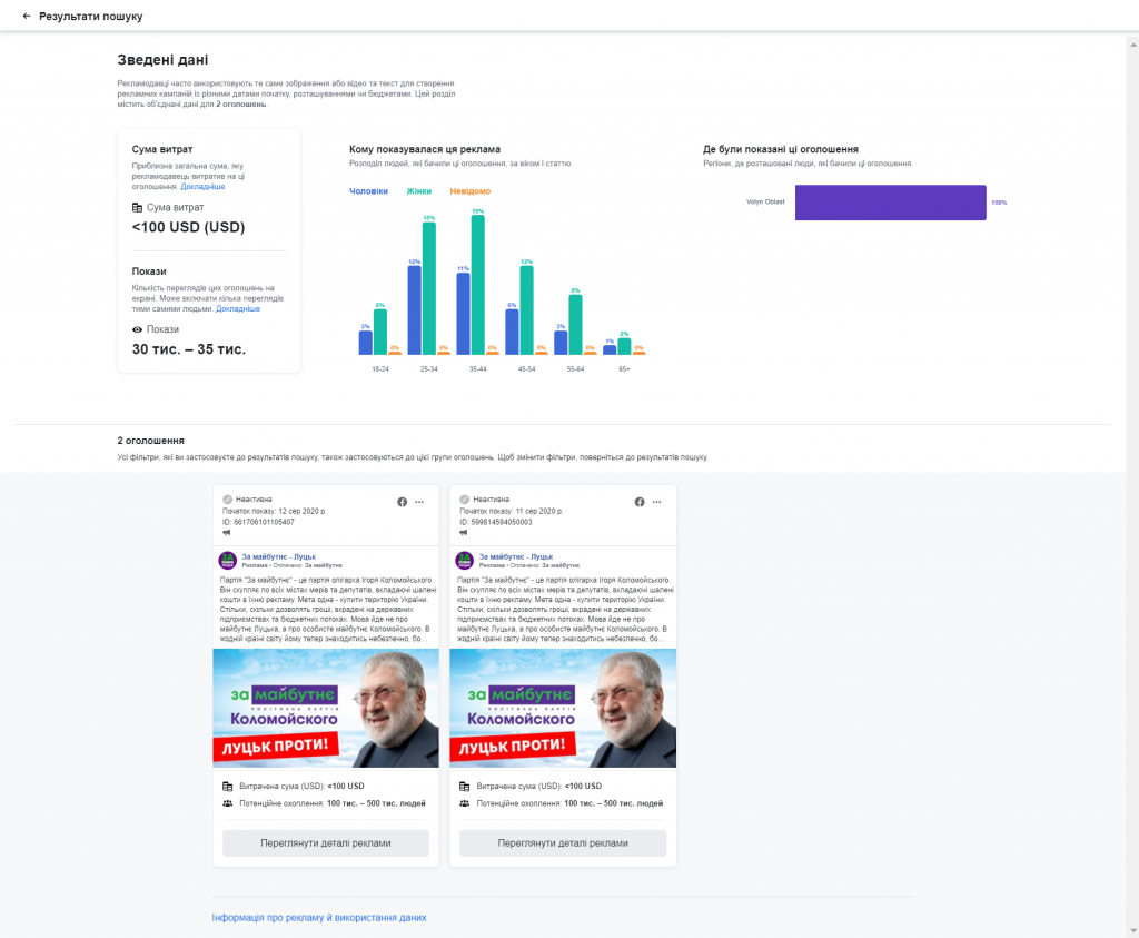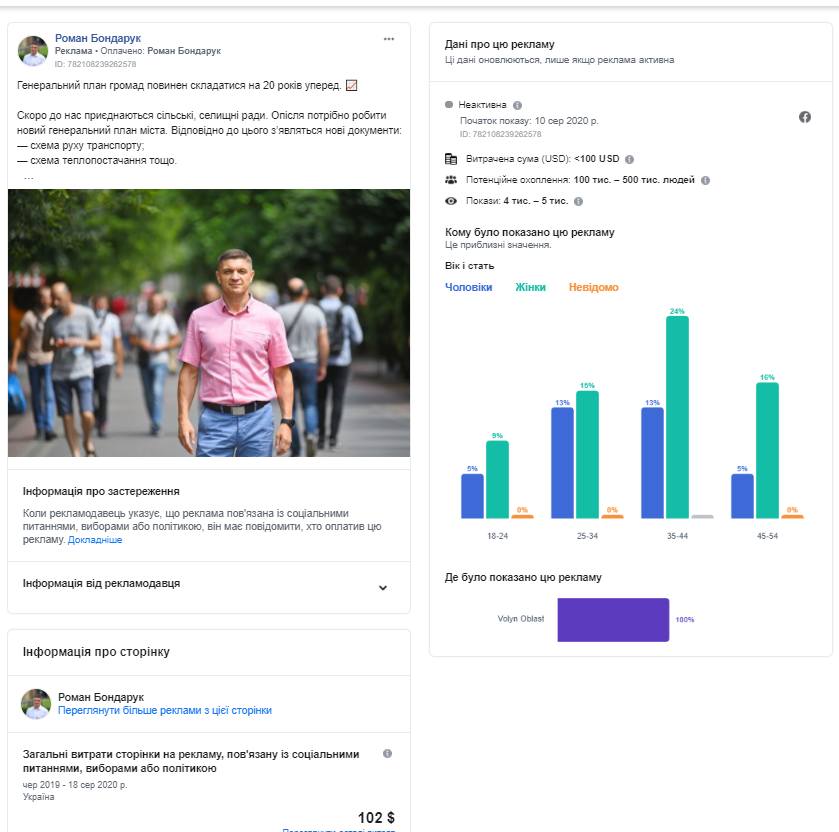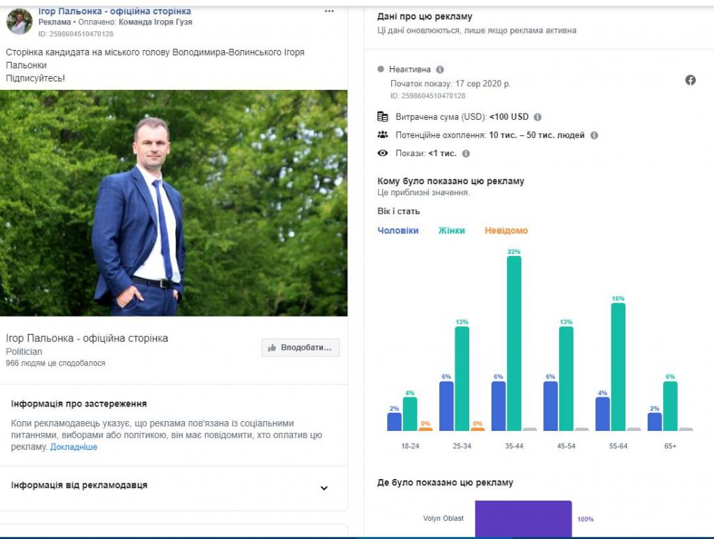 Протягом серпня 2020 року у Бібліотеці реклами Facebook було виявлено десятки рекламних повідомлень, пов’язаних із соціальними питаннями, виборами або політикою, на публічних сторінках волинських політиків та імовірних кандидатів на місцевих та перших виборах 25 жовтня 2020 року, а от партії у цьому напрямку працювали менш активно.