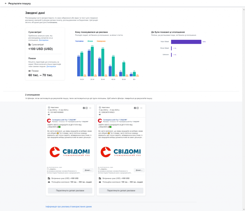Зокрема, на сторінці «Громадянський Рух «СВІДОМІ» рекламувалися 7 публікацій. Йдется про три унікальні пости та про ще два однакових. Реклама таргетувалася переважно на волинян (частка переглядів за межами області менше 1%). Одна із публікацій стосувалася організованого «Свідомими» акустичного вечора пам’яті Андрія Кузьменка, інша – містила ролик про результати діяльності організації за 2 роки, ще в одній лідер «Свідомих», депутат Луцької міської ради Андрій Покровський закликав містян взяти участь в онлайн-голосуванні за осіб, які можуть стати кандидатами у депутати. Окрім того, дві ідентичні публікації розповідали про зустріч Андрія Покровського та команди «Свідомих» із учасниками проекту «Стань депутатом Луцькради», ще дві – інформували про деталі цієї кампанії.