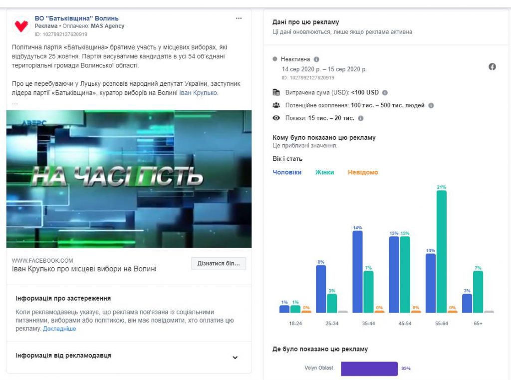 На сторінці «ВО «Батьківщина» Волинь» виявлено 3 рекламні публікації, витрати на кожну із яких становили від 0 до 100 доларів, а таргетувалася реклама на мешканців Волині. Один із дописів стосувався позиції партії щодо діяльності гральних закладів у Луцьку, ще один цитував слова заступника лідера ВО «Батьківщина» Івана Крулька місцевому виданню, а третій, із прикріплення ефіру телеканалу «Аверс» за участі Івана Крулька повідомляв про те, що ВО «Батьківщина» братиме участь у виборах 25 жовтня.
