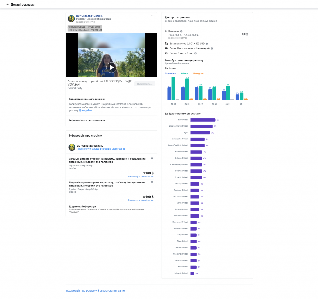 На сторінці «ВО «Свобода» Волинь» станом на 20 серпня зафіксоване лише одне рекламне повідомлення, пов’язане із соціальними питаннями, виборами або політикою. Йдеться про пост «Активна молодь–рушій змін! Є СВОБОДА – БУДЕ УКРАЇНА!», який містить відео із відповідною назвою. Таргетувалася ця реклама на різні регіони України: найчастіше її показувало у Львівській області (9%), а на Волинь припадає 35 показів. Оплатив рекламу Микола Федік.
