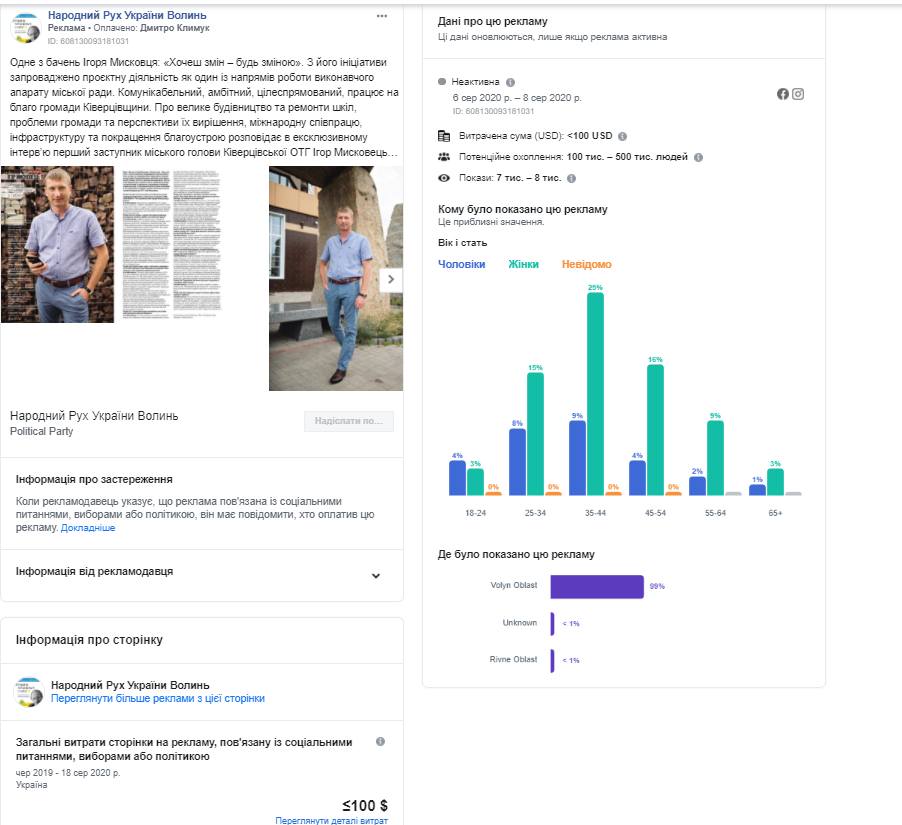 Зі сторінки «Народний Рух України Волинь» станом на 20 серпня також рекламували лише один допис. У ньому посилаються на інтерв’ю чинного першого заступника міського голови Ківерцівської ОТГ Ігоря Мисковця про роботу у громаді.