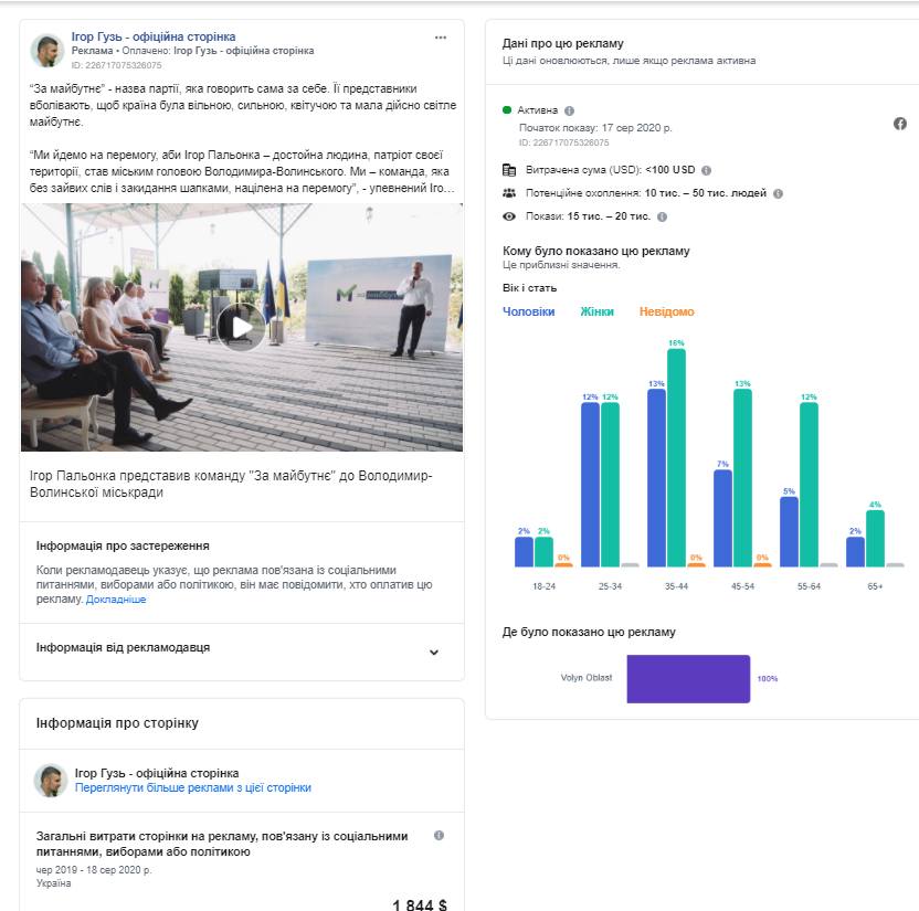 У серпні 2020 року на сторінці народного депутата Ігоря Гузя («Ігор Гузь – офіційна сторінка»), котрий є членом депутатської групи «За майбутнє», з’явилося 5 рекламних постів (2 з них – активні станом на 20 серпня). Три із них були унікальними й у кожному згадувався потенційний кандидат на посаду міського голови Володимира-Волинського Ігор Пальонка. Публікації таргетувалися лише на користувачів із Волинської області, і кожна із них вартувала у межах від 0 до 100 доларів. Ще два пости «рекламували» ефір Ігоря Гузя під назвою «Чому Віктор Сапожніков має піти!». Віктор Сапожніков – міський голова Нововолинська. Вони таргетувалися переважно на Волинську область – у 82% випадків.