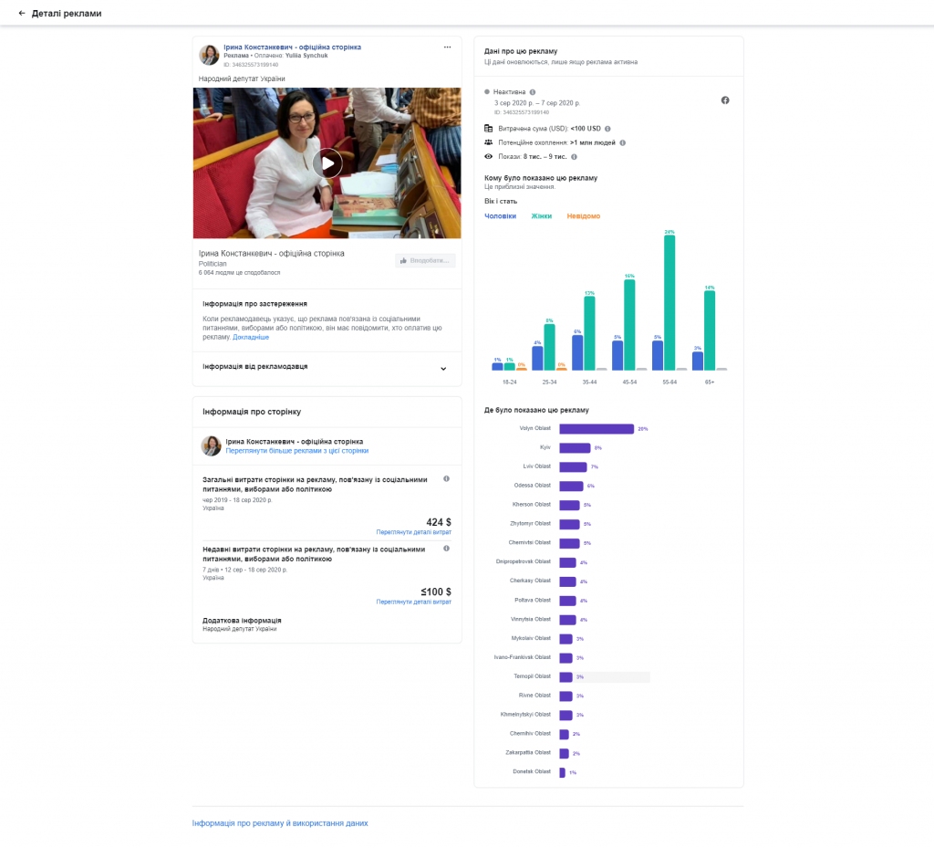 Зі сторінки народної депутатки Ірини Констанкевич («Ірина Констанкевич – народний депутат») у серпні рекламували 6 публікацій, пов’язаних із соціальними питаннями, виборами або політикою. Усі розміщені матеріали вартували від 0 до 100 американських доларів. У постах висвітлювали діяльність Ірини Констанкевич як депутатки: розповідали про відвідини виборчого округу №23 та про звернення щодо відновлення туристичних об’єктів. Також одна рекламна публікація містила відео ефір із телеканалу «Аверс» за участі нардепки. Публікації таргетувалися переважно на Волинську область, однак пост-рекламу офіційної сторінки побачили й у низці інших регіонів.