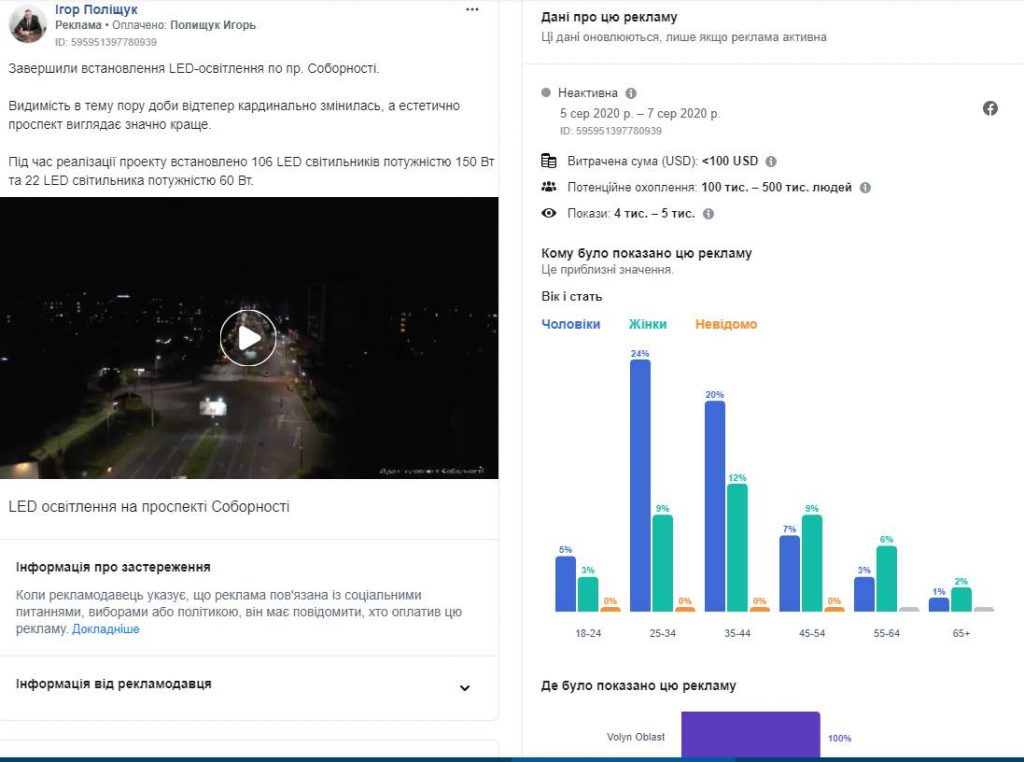 Зі сторінки Ігоря Поліщука («Ігор Поліщук») рекламу у серпні вмикали рекордну для Волині кількість разів – 12. Ігор Поліщук є депутатом Луцької міської ради та радником міського голови. Публікації стосувалися «господарської» частини життя міста – освітлення вулиць, капітальних ремонтів будівель, доріг чи тротуарів, передачі лікарням апаратів штучної вентиляції легень, куплених за бюджетні кошти тощо. Також один пост стосувався незгоди із внесенням Луцька до карантинної червоної зони у зв’язку із поширенням епідемії коронавірусу.
