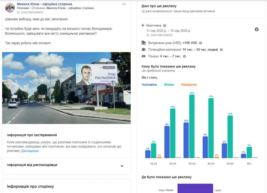 На сторінці потенційного кандидата на посаду очільника Володимира-Волинського Миколи Юнака («Микола Юнак – офіційна сторінка») протягом 1-20 серпня розміщено 3 рекламні пости, таргетованих у межах Волинської області. Один із них – посилання на інтерв’ю Миколи Юнака місцевому виданню, інший стосується вартості ремонту однієї із вулиць у місті, а третій – про білборди потенційного конкурента на виборах Ігоря Пальонки.