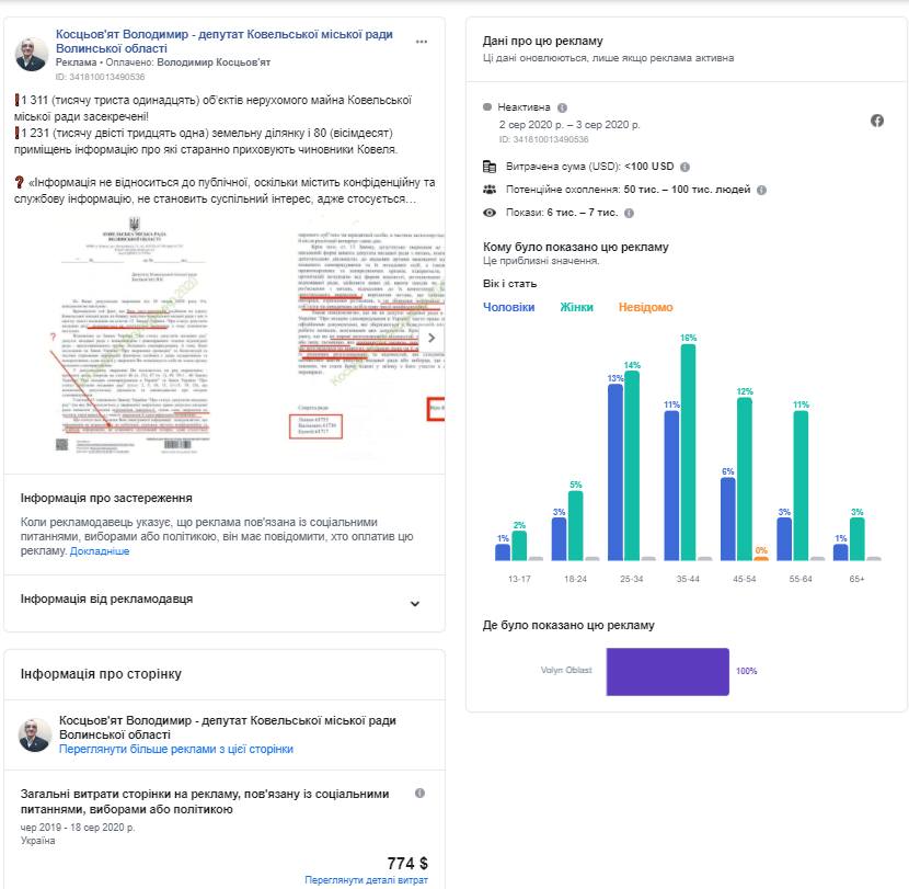 Facebook-сторінка «Косцьов’ят Володимир – депутат Ковельської міської ради Волинської області» станом на 20 серпня «рекламувала» дві ідентичні публікації, пов’язані із соціальними питаннями, виборами або політикою. У дописі Володимир Косцьов’ят розповідає про об’єкти міської комунальної власності та їх «засекреченість». Реклама таргетувалася на Волинську область та коштувала від 0 до 100 доларів.