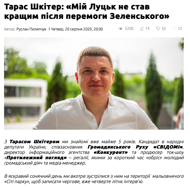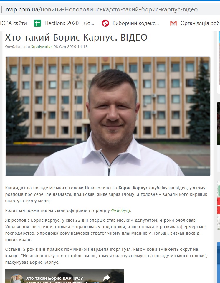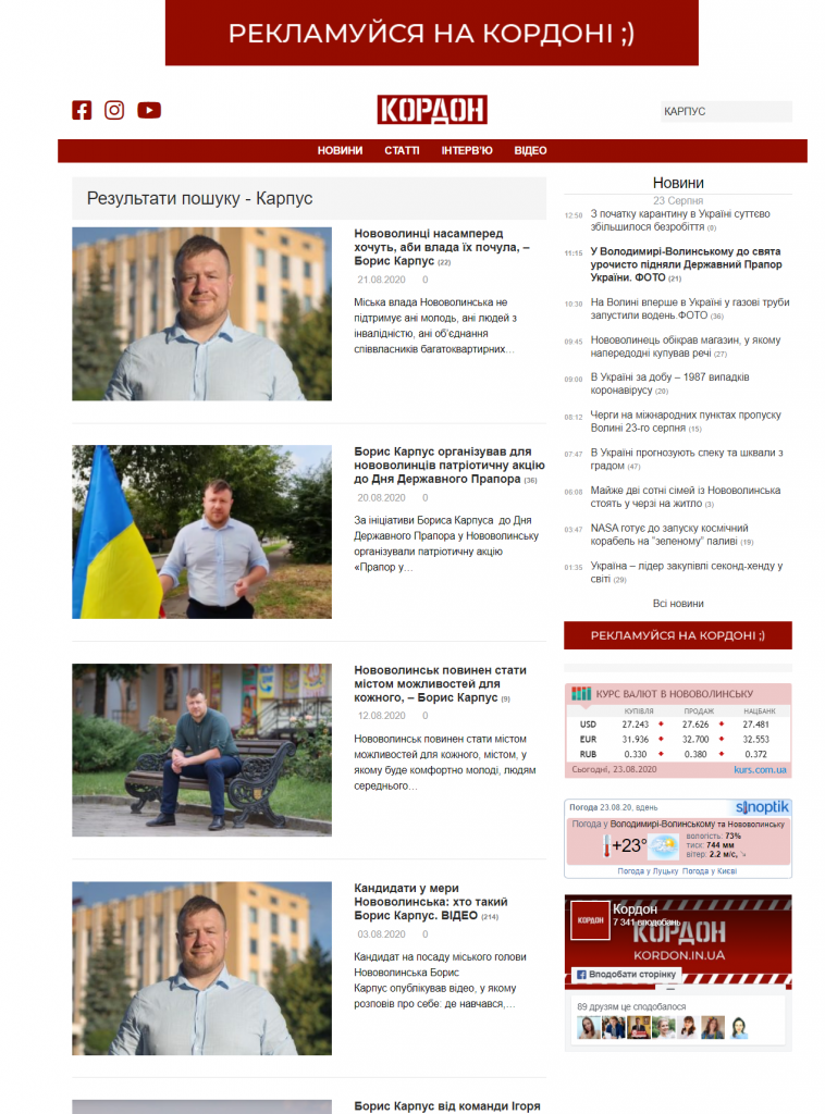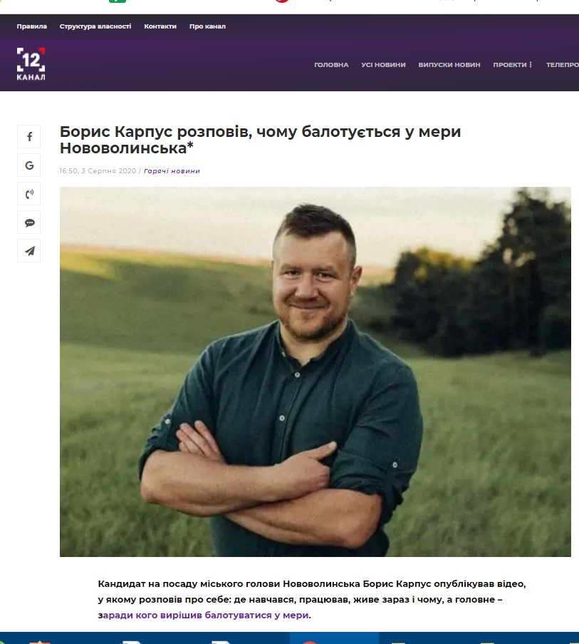 Зокрема, 3 серпня на сайті «12 каналу» вийшла новина з посиланням на Facebook-сторінку потенційного кандидата у мери Нововолинська Бориса Карпуса, у якій містився ролик із розповіддю, чому він вирішив балотуватися, Матеріал мав назву «Борис Карпус розповів, чому балотується у мери Нововолинська*». Аналогічні тексти під іншими заголовками з’явилися ще на кількох виданнях.