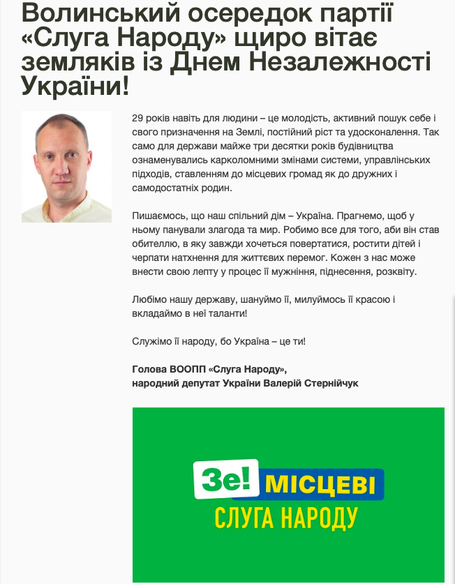 Партію «Слуга народу» згадували переважно поряд із іменами її місцевих лідерів: «Перший» 13 серпня опублікував інтерв’ю із очільником обласного осередку Валерієм Стернійчуком. Також у серпні видання «Волинь24» розмістило вітання волинянам із Днем незалежності, а видання «Бізнес.Район» – інтерв’ю із співголовами обласного штабу Ігорем Лісовським та Олександром Сачуком (останні два із тегом «реклама»).
