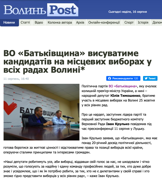 Окрім того, кілька згадок має партія «Батьківщина». Після прес-конференції нардепа Івана Крулька 11 серпня у Луцьку три видання повідомили, що партія має намір висувати своїх кандидатів по всій області. Новина на ІА «ВолиньPost» маркована зірочкою, а от «БУГ» та «Волинь24» виставили новини із заходу без жодних позначок.