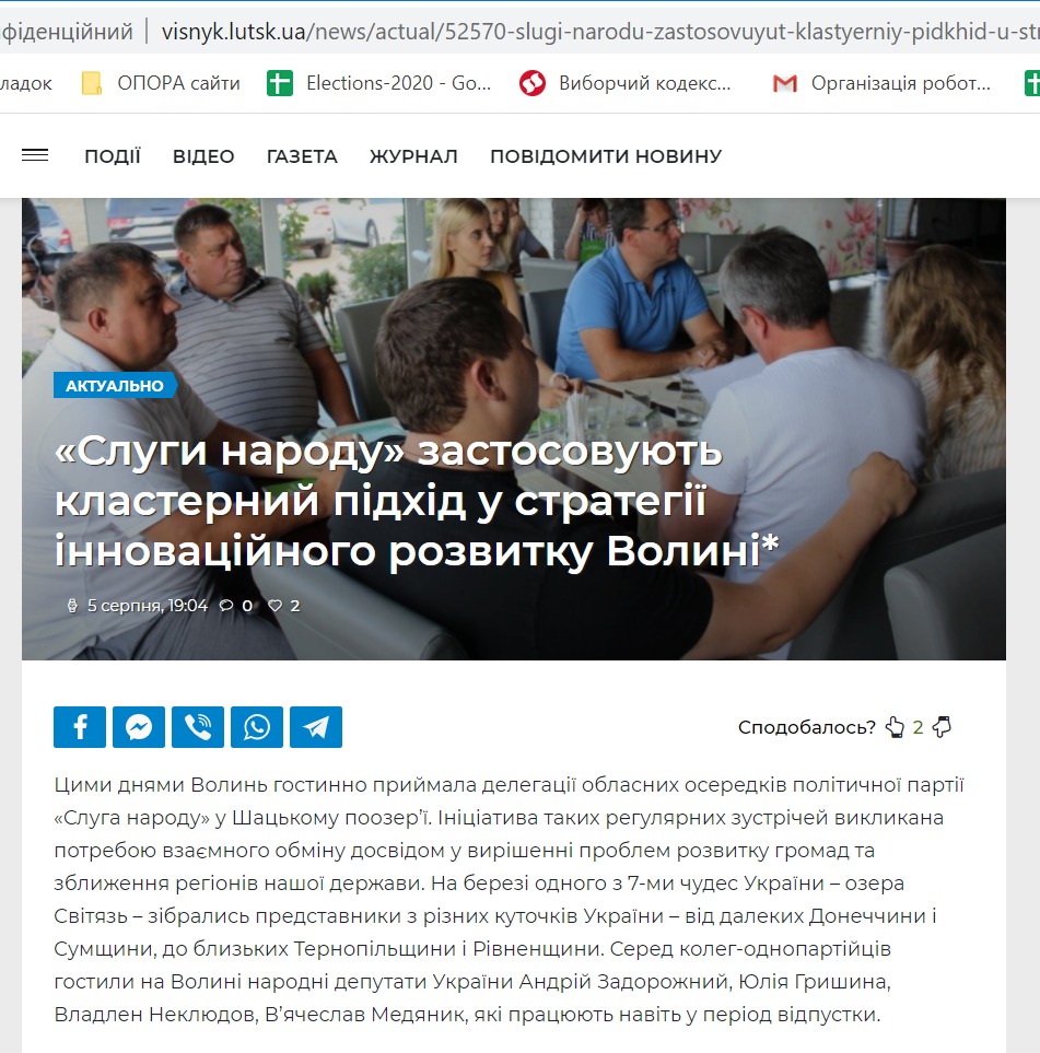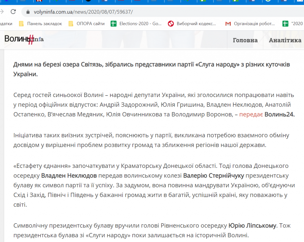 5 серпня на сторінці інтернет версії газети «Вісник» з’явилася публікація «Слуги народу» застосовують кластерний підхід у стратегії інноваційного розвитку Волині», яку позначили зірочкою. У публікації розповідається про з’їзд делегацій партійних осередків, котрий відбувся на Волині. 7 серпня на сторінці інтернет видання «Волинь-24» з’явилася публікація під назвою «Президентська булава зі «Слуги народу» поки залишається на історичній Волині. ФОТО. ВІДЕО» без жодного маркування. За винятком заголовка та дещо зміненого вступу, ця публікація – ідентична до попередньої, та проілюстрована тими самими знімками. Окрім того, цю ж публікацію під заголовком «На Світязі побувала група нардепів від «Слуги народу». Чому?» опублікував сайт «t1.ua – Твій портал». Також матеріал «Що робили «Слуги народу» на Світязі» 7 серпня вийшов у виданні ІА «ВолиньPost».