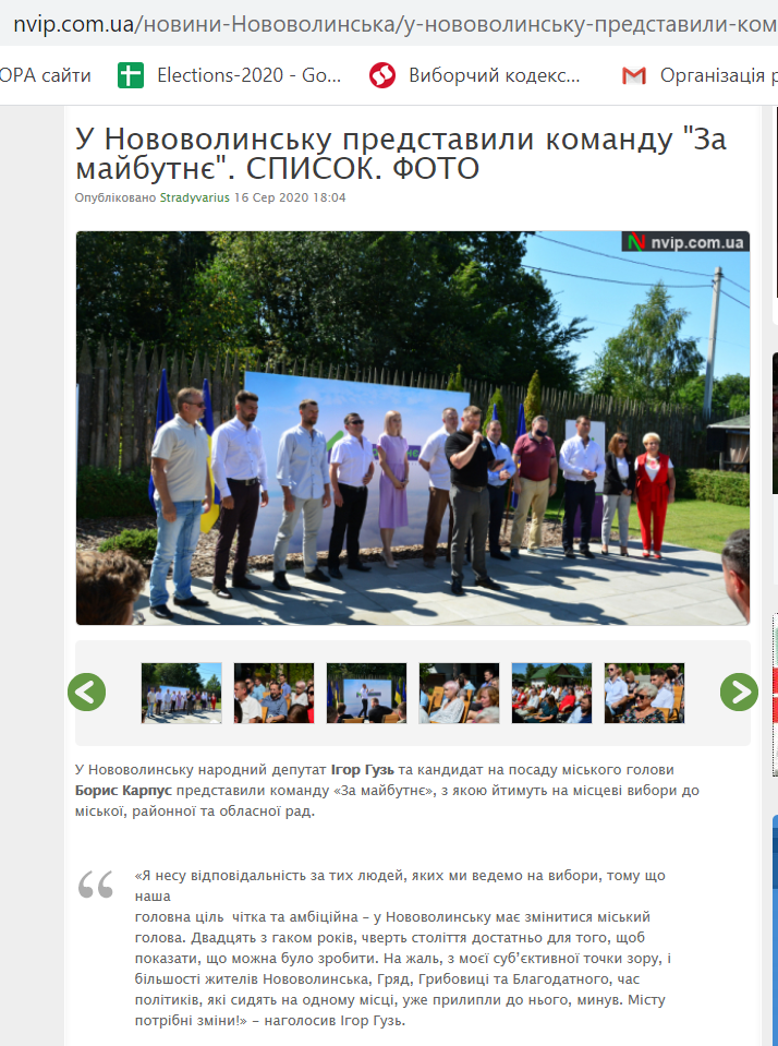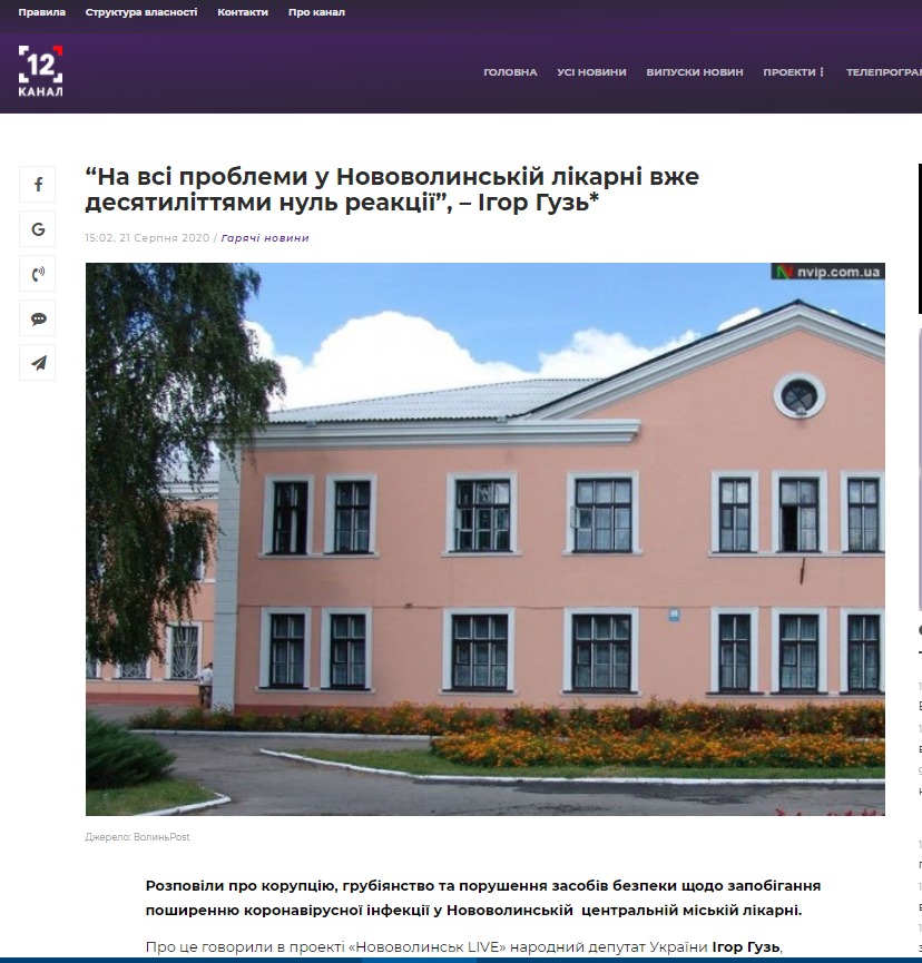 20 серпня матеріал із ефіром проєкту «Нововолинськ LIVE» стосовно стану справ у Нововолинській лікарні за участі нардепа та потенційного кандидата до Волинської обласної ради Ігоря Гузя, а також потенційного кандидата у мери Нововолинська Бориса Карпуса з’явився на кількох онлайн-ресурсах. Проте новина «На всі проблеми у нововолинській лікарні вже десятиліттями – нуль реакції», – Гузь на сайті «12 каналу» маркована зірочкою, а ідентичні матеріали на ІА «Волинські Новини», «ВолиньPost» та сайті «Під прицілом» не позначені жодним чином.