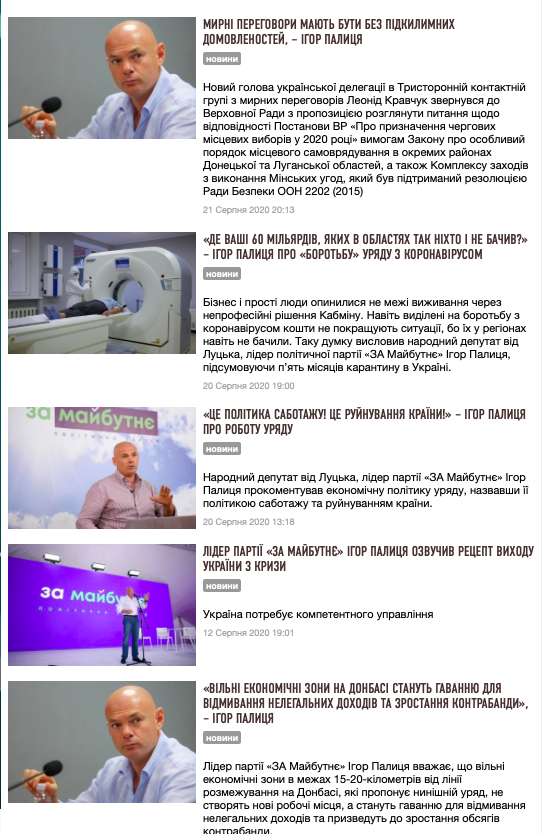 Очільника партії, нардепа від Волині Ігоря Палицю із зазначенням політсили цитувало найчастіше Інформаційне агентство «Волинські Новини» – тут вийшло 8 таких новини. Деякі з них були безпосередньо «партійними»: розповідали про мету на виборах, про її співпрацю із Аграрною партією України. Інші ж висвітлювали позицію лідера партії щодо окремих питань із економіки, тристоронньої переговорної групи у Мінську.