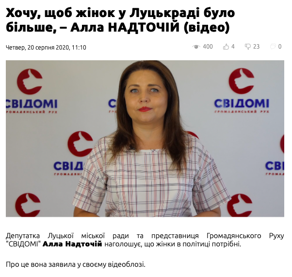 Окрім того, тут розміщували коментарі депутатки Луцької міської ради та представниці «Свідомих» Алли Надточій щодо необхідності жінкам балотуватися, розповідали про заходи, організовані «Свідомими», інтерв’ю зі співзасновником Руху Тарасом Шкітером, де вказано, що команда змагатиметься на виборах до Луцькради.
