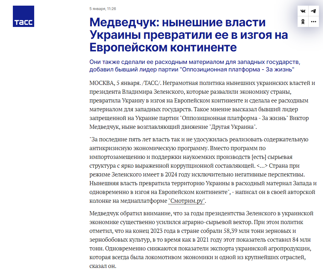 Російська пропаганда продовжує поширювати вигадки на воєнну тематику використовуючи колишніх політиків-маріонеток. Наприклад, на сайті російського пропагандистського агентства ТАСС поширюють думку, як «істину» проросійського політика Віктора Медведчука, якого півтора року тому обміняли на українських полонених. Видання подає думку політика, як факт у тексті з назвою «Медведчук: нинішня влада України перетворила її на вигнанця на Європейському континенті».